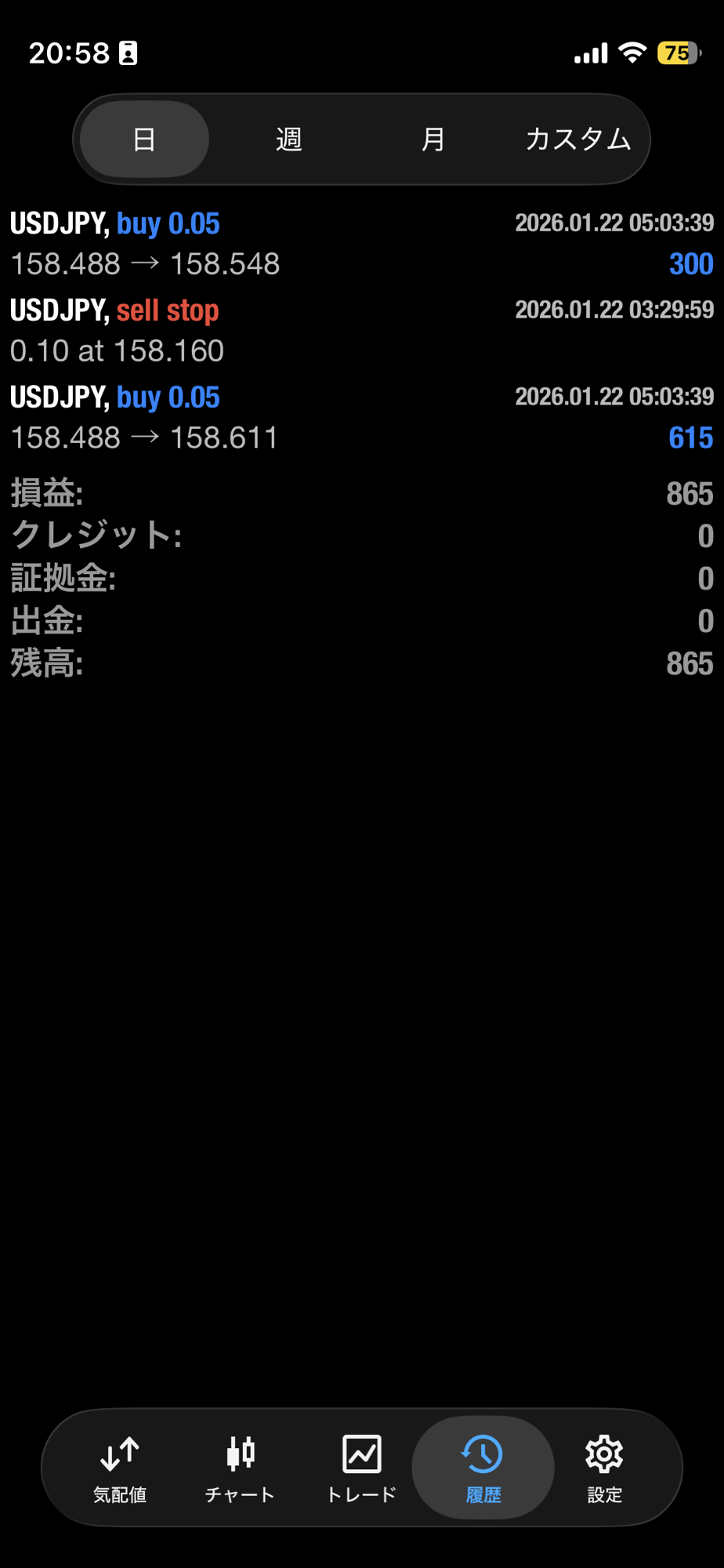 【FX自動売買ツール2 1月22日の運用結果】 トレード結果 X Facebook LINE コピー コメント 2026.01.22 超安定 ドル円 2ポジション シンプルEA (No.1030)日利 865円(0.1ロット)