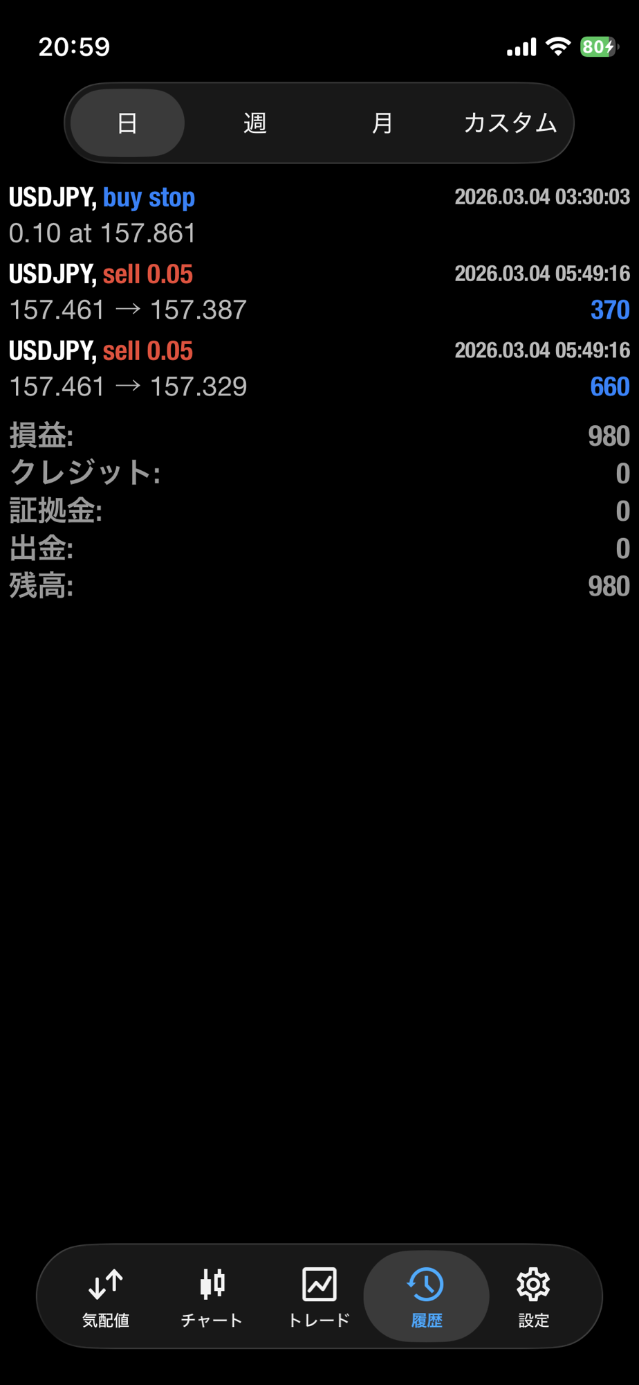 【FX自動売買ツール2 3月4日の運用結果】 トレード結果 X Facebook LINE コピー コメント 2026.03.04 超安定 ドル円 2ポジション シンプルEA (No.1030)日利 980円(0.1ロット)