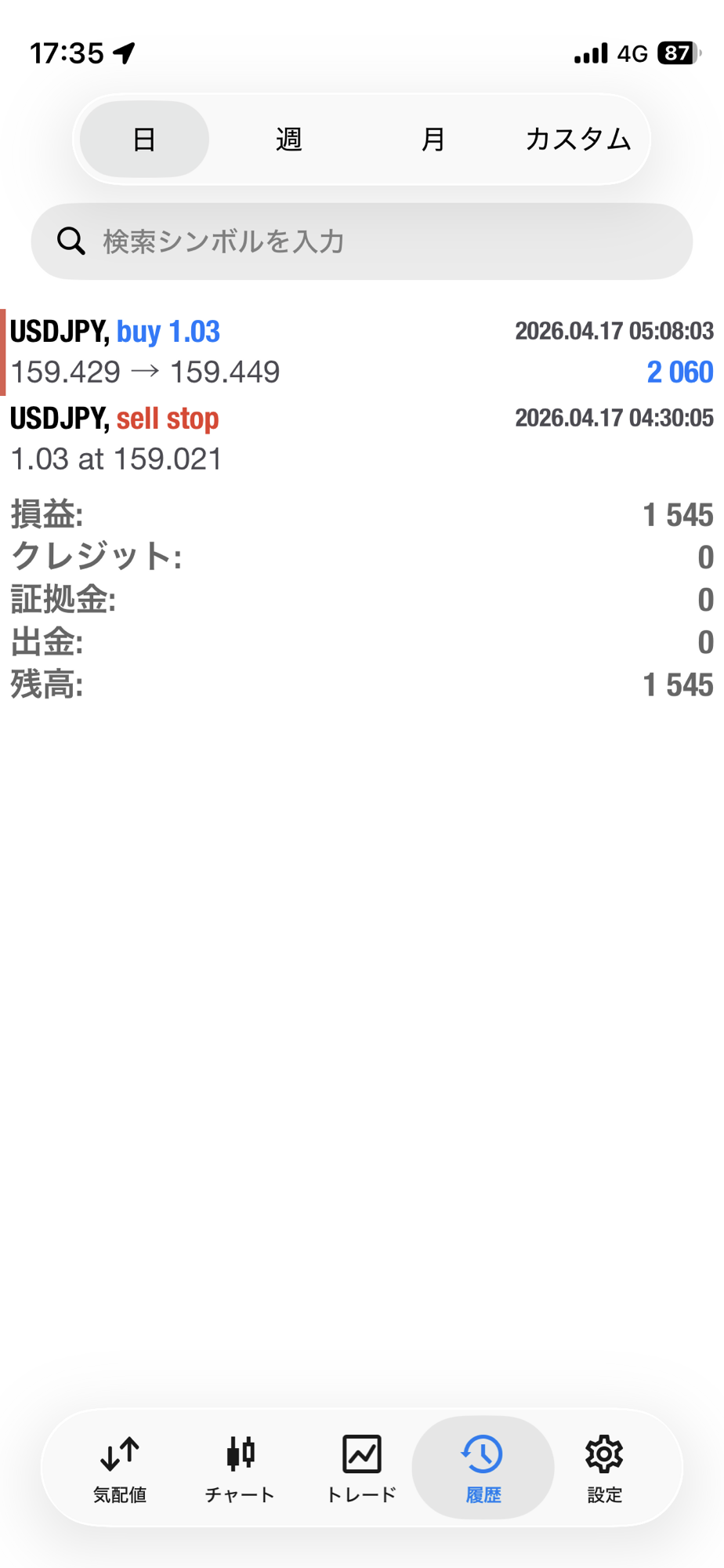【FX自動売買ツール2a 4月17日の運用結果】 トレード結果 X Facebook LINE コピー コメント 2026.04.17 超安定 ドル円 2ポジション シンプルEA (No.1030)日利 1545円(自動ロット)
